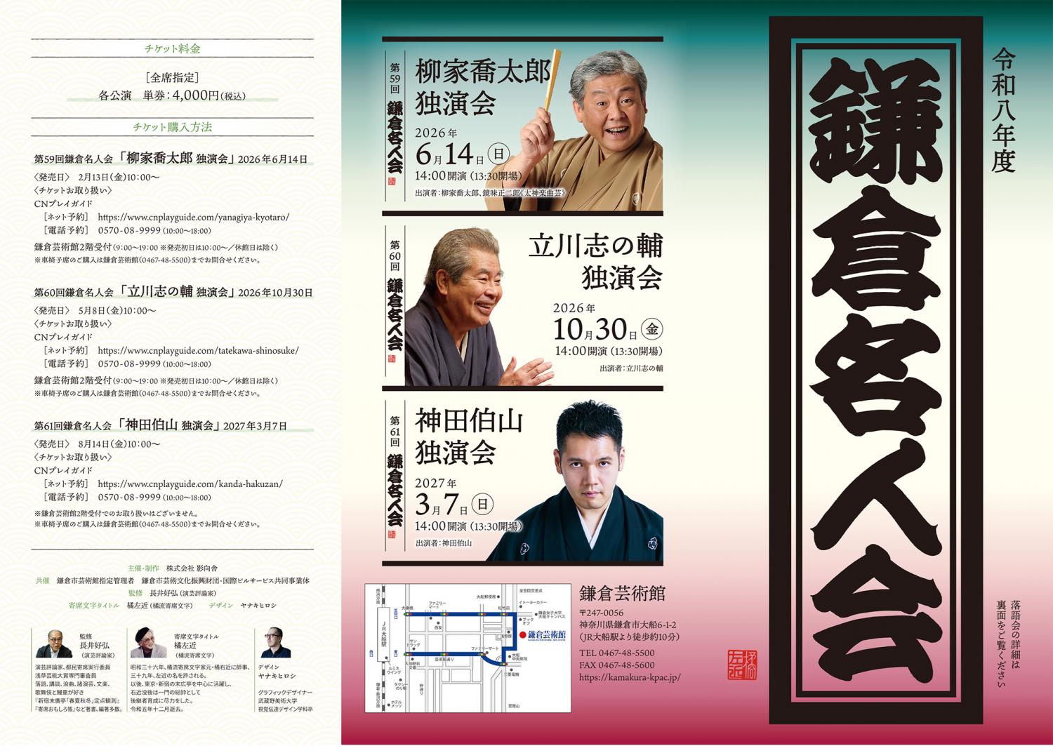 | チケットのお取り扱い | ■鎌倉芸術館2階受付(9:00~19:00※発売初日は10:00~/休館日は除く) |